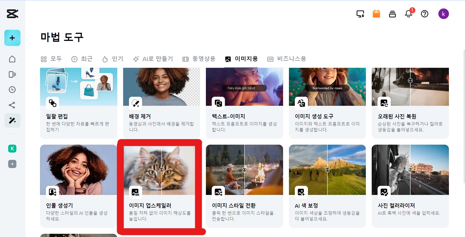 2. 마법 도구아래에 이미지 업스케일러를 클릭해주세요